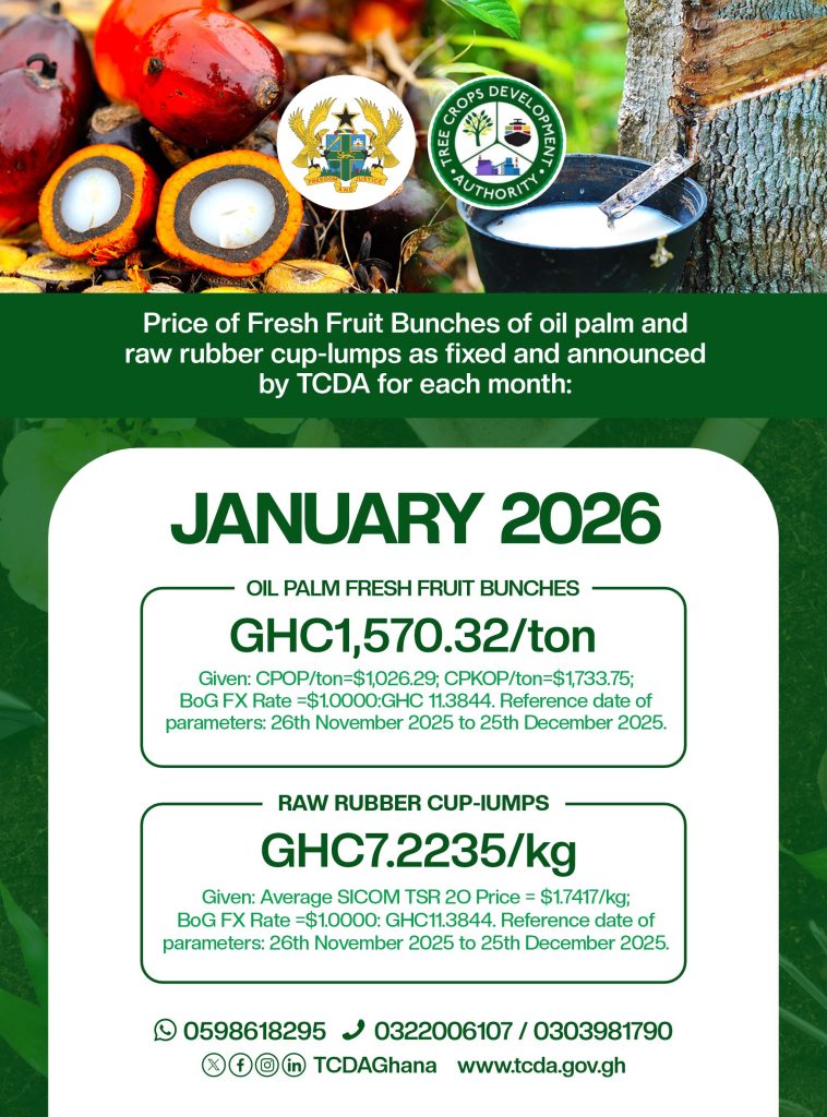 Price of Fresh Fruit Bunches of oil palm and raw rubber cup-lumps as fixed and announced by TCDA for January 2026 GOVERNMENT SETS GHS 12.00 PER KILOGRAM AS MINIMUM PRODUCER PRICE FOR RAW CASHEW NUTS (2025/2026 SEASON). Price of Fresh Fruit Bunches of oil palm and raw rubber cup-lumps as fixed and announced by TCDA for February 2026